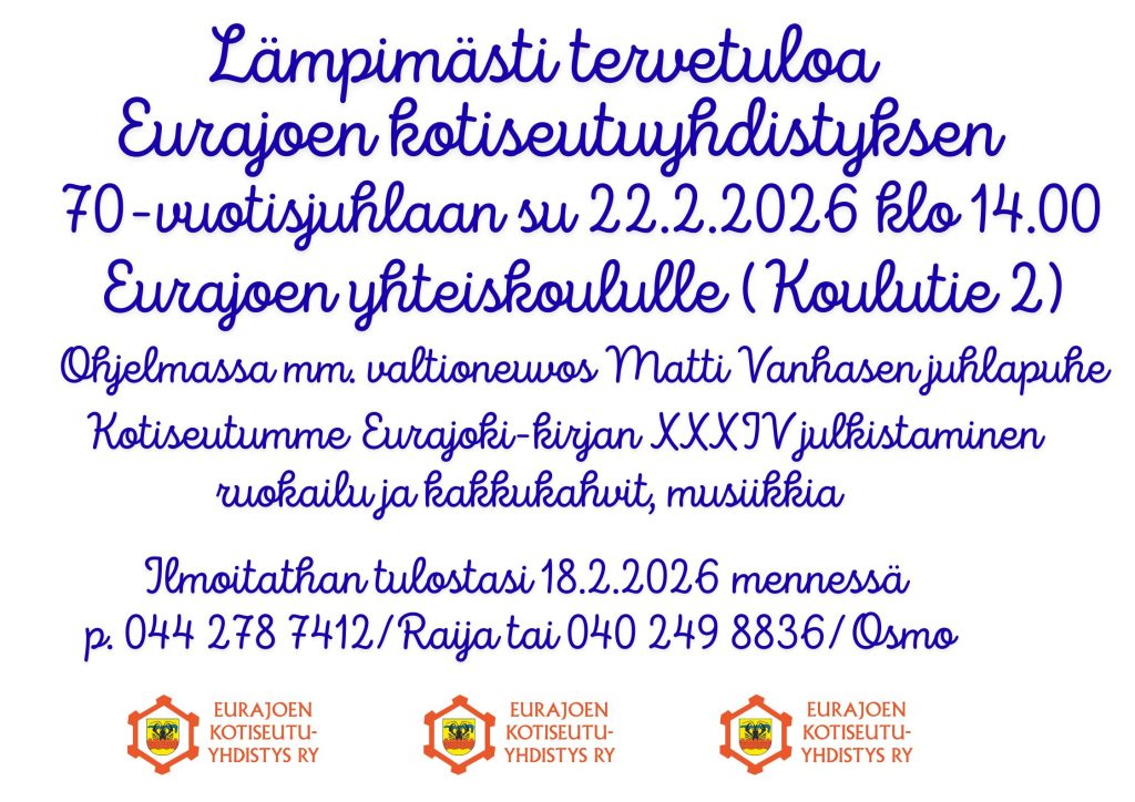 Voit tutustua toimintaamme tarkemmin sivun ylälaidan valikoista ja lisätietoa meistä on myös Facebookissa: Eurajoen kotiseutuyhdistys tai Hevoskynnön SM-kisat.
